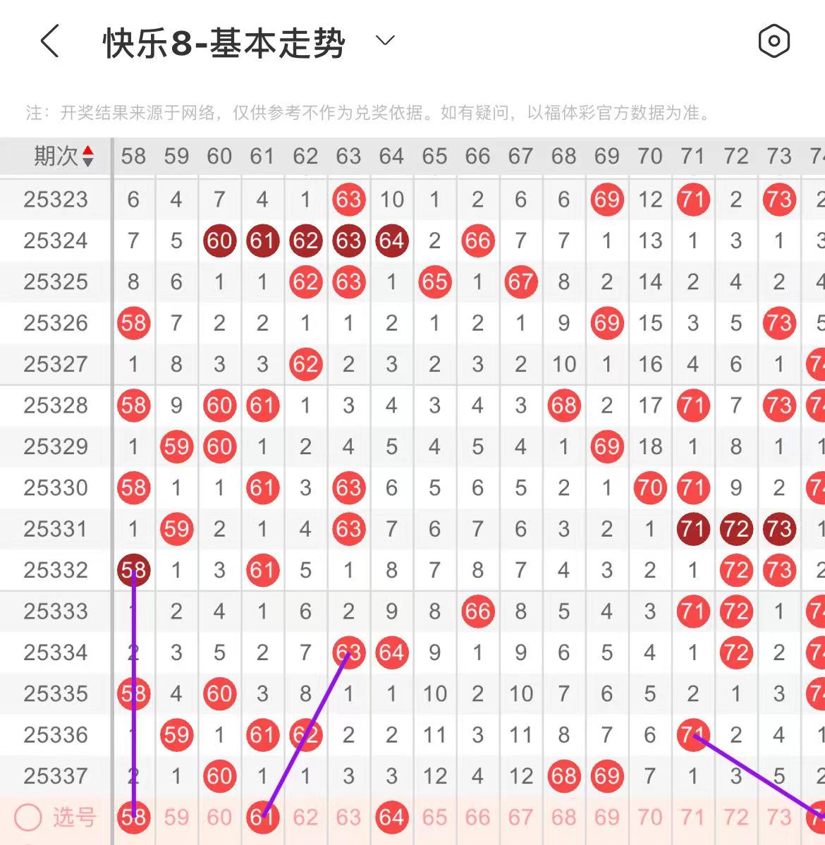 61-70区:本区间上期开出了两个号码, 从号码走势图上看,该区现属于冷号区,在选号上建议以防为主,待其号码走势回补后再着手考虑,本期出号个数在一两个号码左右。有出号走势的号码有61号,双线斜连出号走势,防61.64同出的可能。