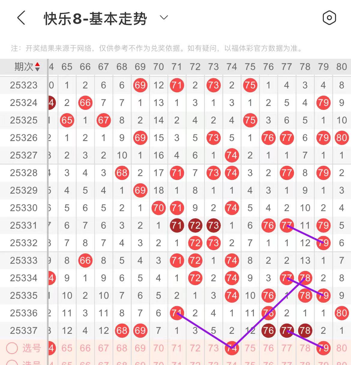 71-80区:本区间上期开出了三个号码,从号码走势图上看,该区号码走势有走冷的趋势,在选号上需谨慎,出号个数在两个号码左右,有出号走势的号码74号,双线斜连出号走势,79号,77对应79出号走势。