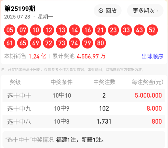 福彩快乐8第2025199期开奖结果: