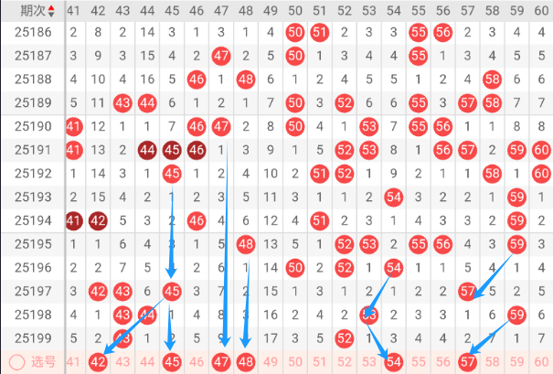 上期当前区段开出2个号码球,再结合前5期出号情况来看当前区段落号率在下降,因此判断本期当前区段出号可能在5个以下,我们再来看下边码,197期没有开出边码号,198期开出43.44边码号,199期开出52边码号,跟据近几期来看 ,基本每期都会开出1到2个边码号,因此判断本期当前区段可能存在1个以上边码号。再来看看重叠号,最近10期都有重叠号码开出。本区段建议保留1到2个号码作为重叠号。接下来看当前区段连号,最近10期基本都有出现连号,上期本区段没有开出连号,本期建议关注42-48之间可能开出连号。本区段重点关注遗漏数据2-5之间号码。