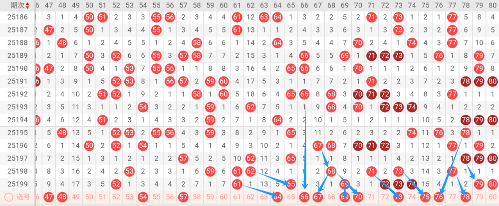 上期当前区段开出8个号码球,再结合前5期出号情况来看当前区段落号率上升,因此判断本期当前区段出号可能在4个以上,我们再来看下边码,197期开出78.80边码号,198期开出61.77边码,199期开出69.72.74边码号,跟据近几期来看 ,基本每期都会开出1到2个边码号,因此判断本期当前区段可能存在1个以上边码号。再来看看重叠号,最近10期都有重叠号码开出。本区段建议保留1到2个号码作为重叠号。接下来看当前区段连号,最近10期基本都有出现连号,上期本区段开出72.73.74.79.80连号,本期建议关注64.-70之间可能开出连号。本区段重点关注遗漏数据0-4之间号码。