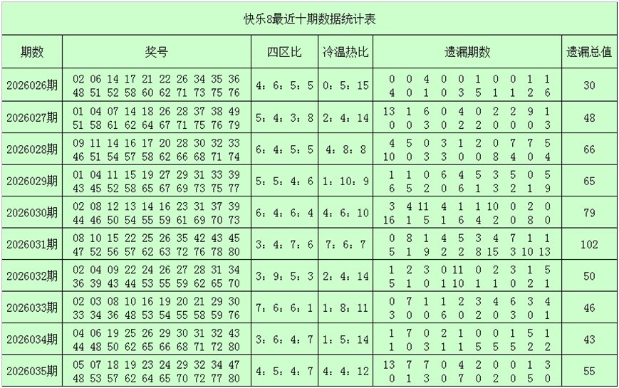 一、快乐8第2026036期奖号分析(定义:遗漏0-2期号码为热码,遗漏3-6期号码为温码,遗漏7期及7期以上号码为冷码,重码为上期开出奖号,邻码为上期没有出现,但与上期奖号差值为1的号码,例如上期开出奖号04,没有出现号码03和05,则本期03和05都为邻码,其它则为孤码。
