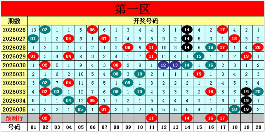 目前第一区包含12个热码:重码4个05、07、18、19,邻码4个04、06、08、20,孤码4个02、03、10、16;包含7个温码:邻码0个,孤码7个01、09、11、12、13、14、15;包含1个冷码:邻码1个17,孤码0个;号码冷温热个数比为1:7:12,重号、邻码、孤码个数比为4:5:11。