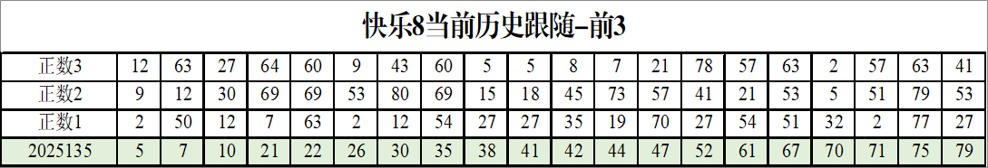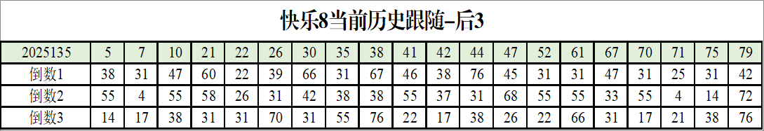 我感觉选热的同时,还要注意防冷条件开出,可以直接选取每个号码跟随出次前三的号码,也可以考虑把出次最后的三个数字加进去,不过这样可能号码太多,可以尝试。图上也能看出单独号码跟随的情况,我就不一一统计每个号码的出次了,我这里考虑提高概率,取每个号码历史跟随的前三号码和后三号码,根据2025135期的号码,我关注正数3和倒数3的号码号码为: