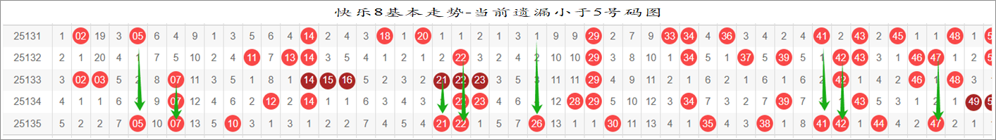 所以这个条件值得关注,从号码分布图上我们可以分析出,遗漏小于5期的号码有:
