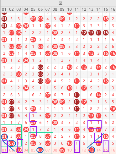 边号1 3 4 6 8 9 11 13 15出1-2码,重号2 7 10三出一,遗漏值隔一期号出多期上图已勾画,本期遗漏值隔1期号1 3 11 15出一码,6是夹子号跟2形态一样上图已勾画,6是一区最冷的号,喜欢冷号就用,16短期最大遗漏6期,本期是第5期,16可以关注,一区倾向走冷,建议选号在4码内,关注五码1 3 4 11 16,防2,一胆4双胆3 4