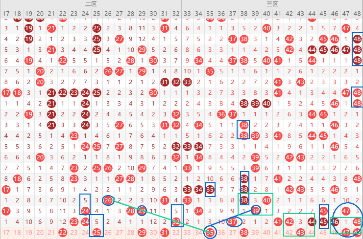 边号36 38 40 43 47出1-2码,重号37 41 42 44 45 46 48出一码,形态上35是斜连号,47是梅花形态 ,上图已勾画,47短期内出现2次梅花形态,夹子号最近出2期,上面的39 46都是夹子号,本期夹子号43 47选一个,短期规律8尾不单出,上图已勾画,本期38 48二出一,有概率同出,关注五码 35 38 42 47 48,防40,一胆48 双胆42 48