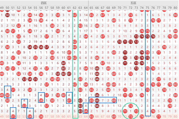 边号65 70 72 74 75 77出1-2码,重号71 73 76出一码,75到短期最大遗漏,5尾在五区出现频率最大,本期65 75 二出一,6开头本期要回补一码,65 69二出一,72是梅花形态,上图已勾画,6尾最热防66 76二出一,关注五码65 69 73 72 78防75,一胆69双胆65 69