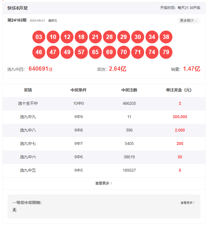 快乐8第24163期的开奖结果:03 10 12 18 21 28 29 30 34 38 46 47 49 57 65 69 70 71 74 79