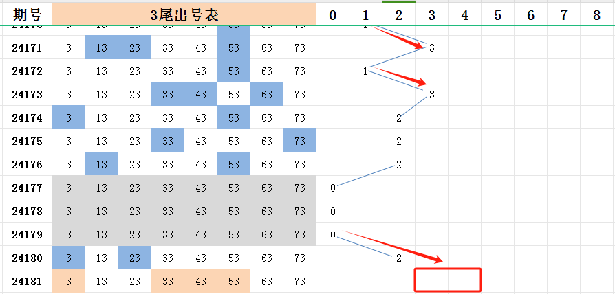 三尾上期开出两码走势,之前连续三期的断尾走势。本期三尾在前尾中还算是不错的尾号。可以看继续开出三码走势或四码走势。