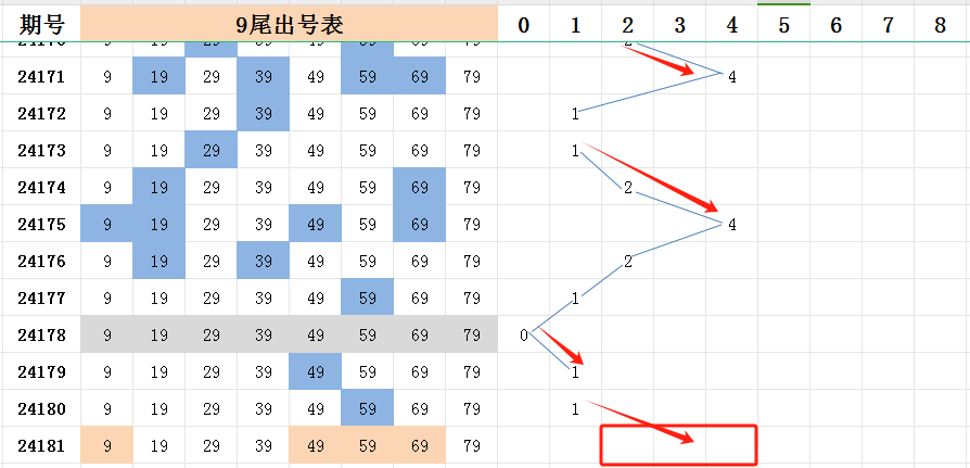 选择九尾的原因,很简单。截至目前,九尾是所有尾号中最热的号码,已开出六次的多码走势(五码及五码以上)。对最热的尾号,应该有应有的尊重。除非九尾的号码走势特别不好。