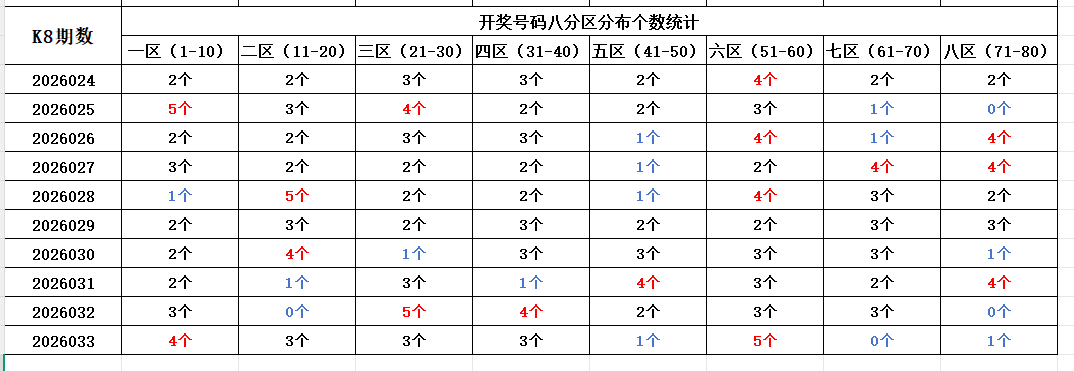如图,红色字体是热号区,区间开出4个及以上号码。蓝色字体是冷号区,区间开出1个及以下号码。以近10期为一个分析周期,依据久热必冷,久冷必热的规律,本期重点关注:一区、六区,区间可能开出3-4个号码。五区、七区、八区,区间可能开出1-2个号码。个人分析,仅供参考。