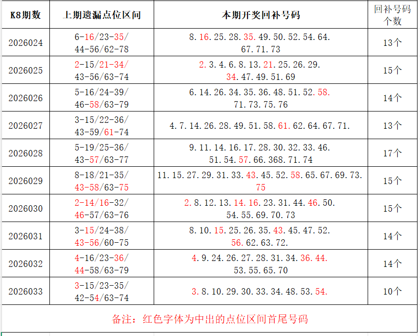 如图,上期的遗漏号码在下期开出10个左右,即为回补号码。定准点位区间首尾号码是关键!以上期2026033期为例,定位4个遗漏区间,围中10码!结合上期开奖号码,以跨度值大于或等于7为依据,本期关注3个遗漏区间:21-29/36-48/59-76;重点关注遗漏区间:4-15/22-37/43-56/63-77。点位区间号码和大底号码请勿混淆,个人分析,仅供参考。