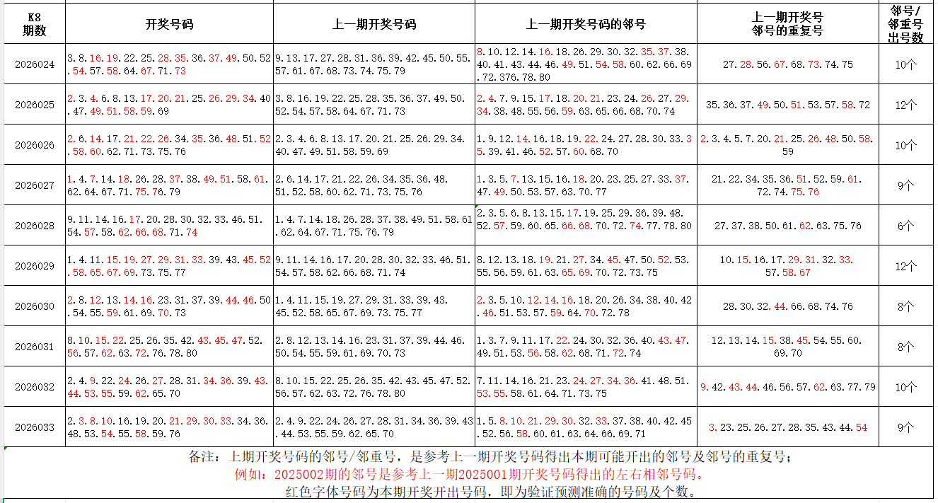 如图,红色字体是上期邻号、邻重号在下期开出,每期开出10个左右。上期邻号开出7个,邻重号开出2个本期参考邻号:1.4.7.11.15.17.18.22.28.31.32.37.47.49.52.56.60.75.77;邻重号:2.3.9.19.20.21.29.30.33.34.35.53.54.55.58.59;个人分析,仅供参考。