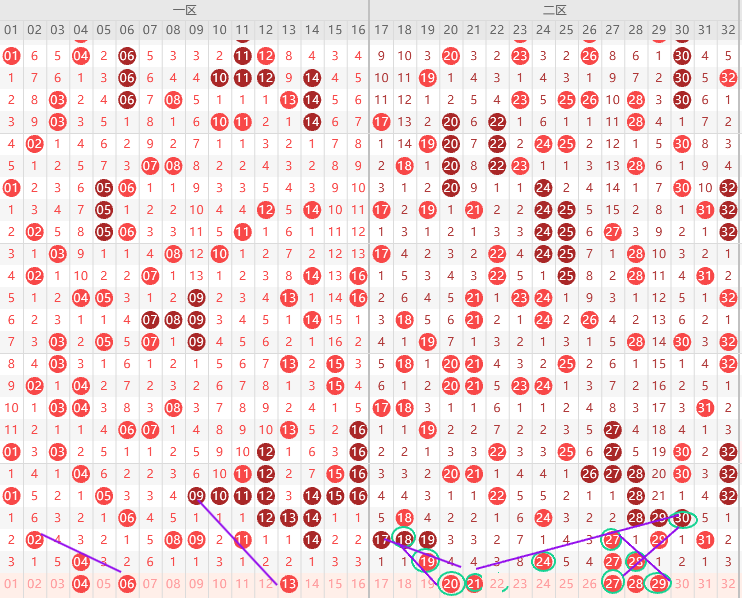 二区胆尾7尾8尾,边号18 20 23 25 26 27 28 29出一码,重号19 24 27 25四出一,形态上20 21 27 29是斜连号,上图已勾画,缩小范围1开头是走冷趋势,本期17 18 19最多一码,2开头稳定出边号全是27以后的边号,那么本期27 28 29出一码,近期冷号出重号没那么快回补,杀掉29就是27 28出一码,3开头算周期本期要有一码,30 31 32三出一,缩小范围3直落都回补,只有32没回补32可以优先关注,8尾最热出5期,如果8尾不断那就是18 28要出一码,1开头出号少,优先关注28,其次18,二区连出5期同尾号上期中断,本期大概率要杀回马枪,防同尾号18 28 或者17 27,结论关注五码17 26 27 28 32防25