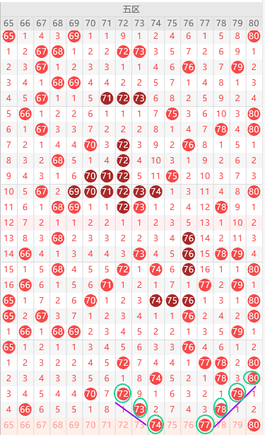 五区胆尾7尾0尾,边号65 67 72 74 77 79出1-2码,重号断2期本期大概率有重号66 73 78出一码,缩小范围重号近期出在7开头73 78出一码,形态上74 77是斜连号,上图已勾画,这种形态要防同尾号67,隔一期号出二期,本期70 72 79大概率会出一码,结论关注五码 67 73 74 77 79 防80