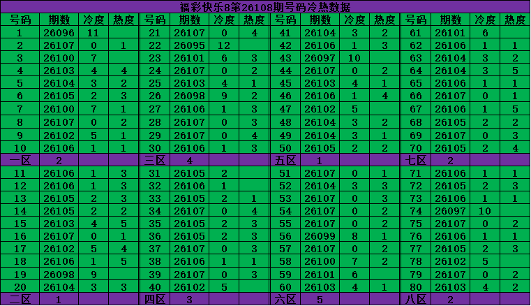 首先把福彩快乐8是从01-80个号码中每期开出20个号码,我们把80个号码分为四个区:一区01-10号,二区11-20号,三区21-30号,四区31-40号,五区41-50号,六区51-60号,七区61-70号,八区71-80号;从上期开出数据选出大底号!