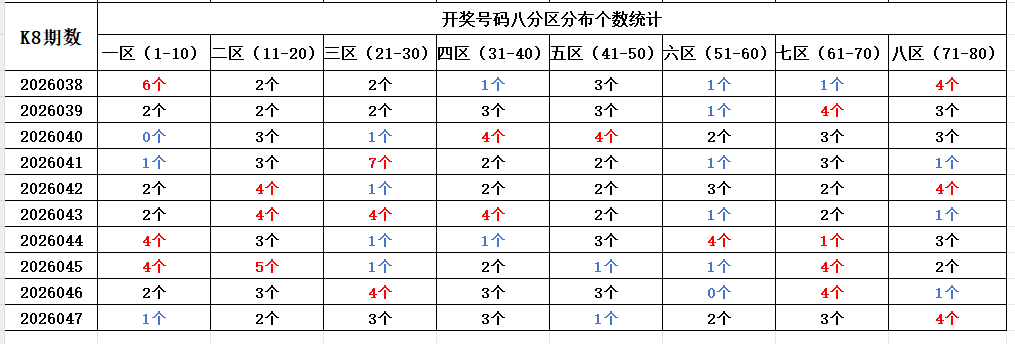 首先看上期回顾,“快乐8”第26047期开奖结果:5.14.16.21.22.28.31.34.37.40.50.51.55.62.63.64.74.75.77.80通过分析开奖号码,分享第一个数据分析:统计开奖号码的八分区冷热走势,判断出号规律。以近10期开奖号码的八分区统计数据为例: