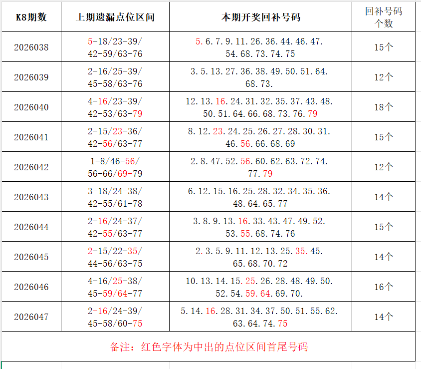 如图,上期的遗漏号码在下期开出10个左右,即为回补号码。定准点位区间首尾号码是关键!以上期2026047期为例,定位4个遗漏区间,围中14码!结合上期开奖号码,以跨度值大于或等于7为依据,本期关注4个遗漏区间:5-14/40-50/55-62/67-74;重点关注遗漏区间:4-15/23-36/42-54/65-76。点位区间号码和大底号码请勿混淆,个人分析,仅供参考。