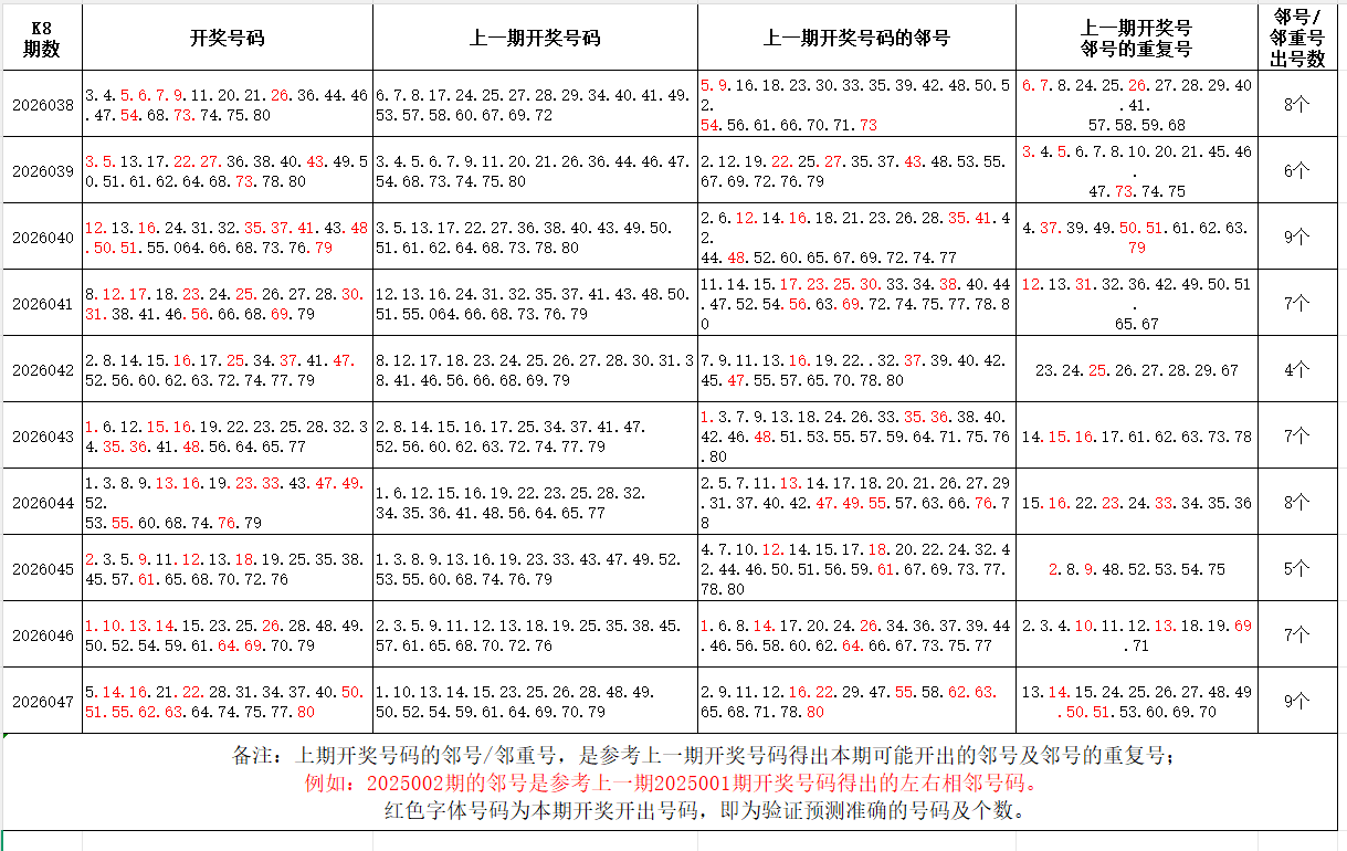 如图,红色字体是上期邻号、邻重号在下期开出,每期开出10个左右。上期邻号开出6个,邻重号开出3个本期参考邻号:4.6.13.17.20.23.27.29.30.32.33.35.36.38.39.41.49.52.54.56.61.65.73.78.79;邻重号:15.21.22.50.51.62.63.64.74.75.76;个人分析,仅供参考。