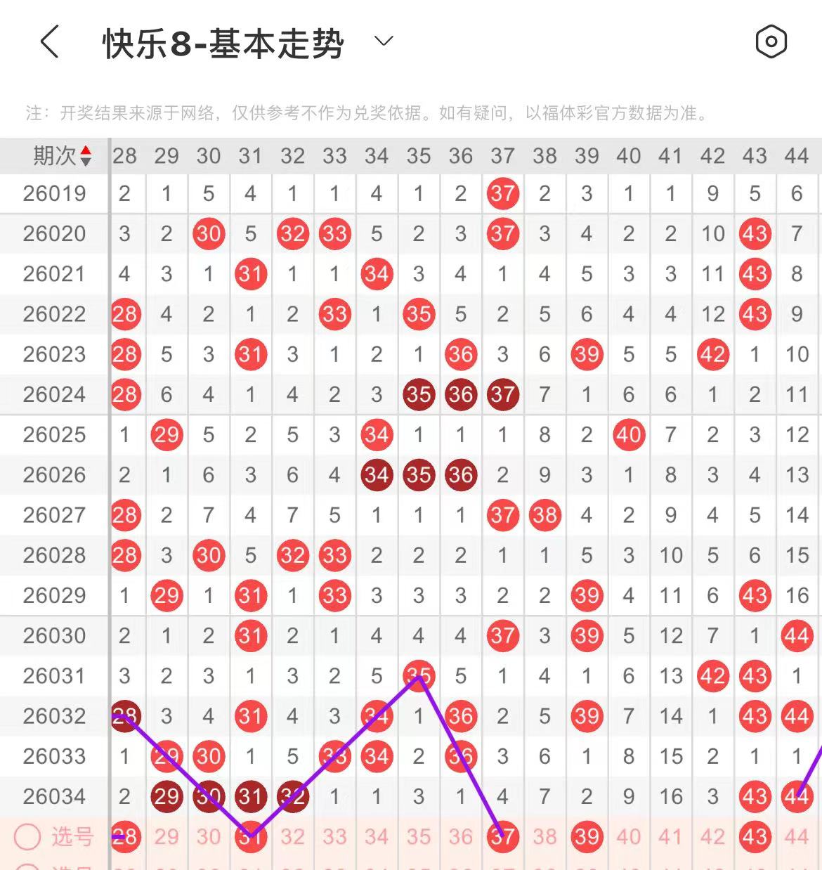 31-40区:本区间上期开出了两个号码,从号码走势图上看,该区现属于温号区,出号个数在两个号码左右,有出号走势的号码有31号,双线斜连出号走势,37号,斜连出号走势,防37.39同出的可能。