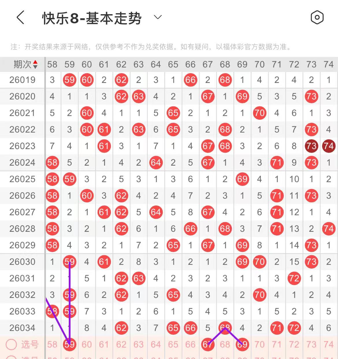 61-70区:本区间上期开出了四个号码,从号码走势图上看,该区断区后直接回补了四个号码,本期注意出号个数减少至两个号码,重点关注后半区号码回补,有出号走势的号码有67.69号,做分边出号考虑。
