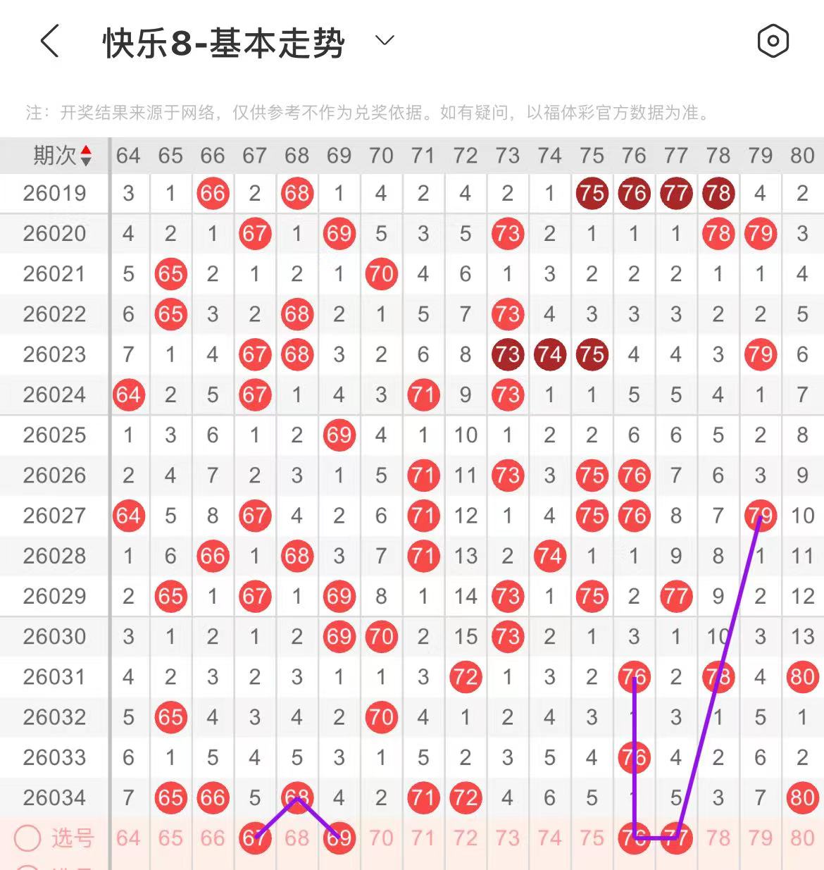 71-80区:本区间上期开出了三个号码,从号码走势图上看,该区现属于温冷区,出号个数在两个号码左右,有出号走势的号码有76号,隔期相同出号走势,77号,斜连出号走势。