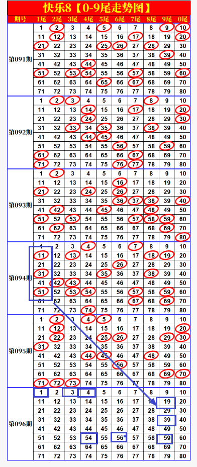 本期画线思路概括:这期先根据昨天开奖号码,选择9尾的三连隔断同尾号码。然后结合上期的7区号码,做出01.03.04组合。每当这种情况的出现,多少会能带出来一两个号码,而且还是三连号,所以我会从这个组合中拿出一到两个当主要号码关注。9尾的组合不是太有把握,结合这两期的走势画出来的,尾号有时候还是很难把控的,就如同上期的7尾,居然一个没给。