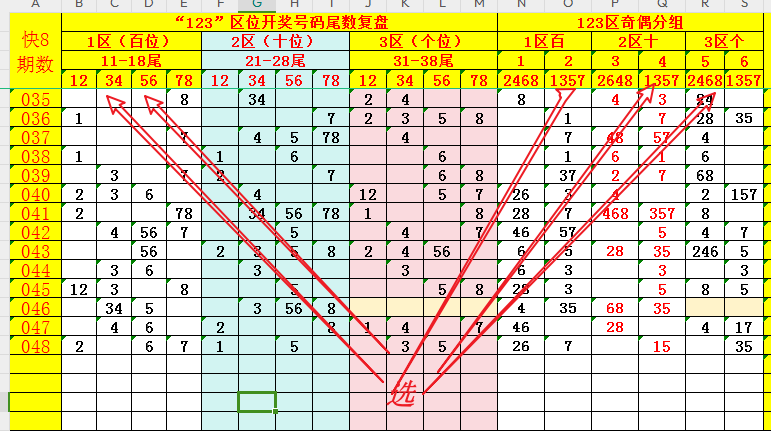 再次,将"1-2-3"区(百位-十位-个位)的号码尾数1至8分别按照偶奇分组,即:偶尾为2468、奇尾为1357。