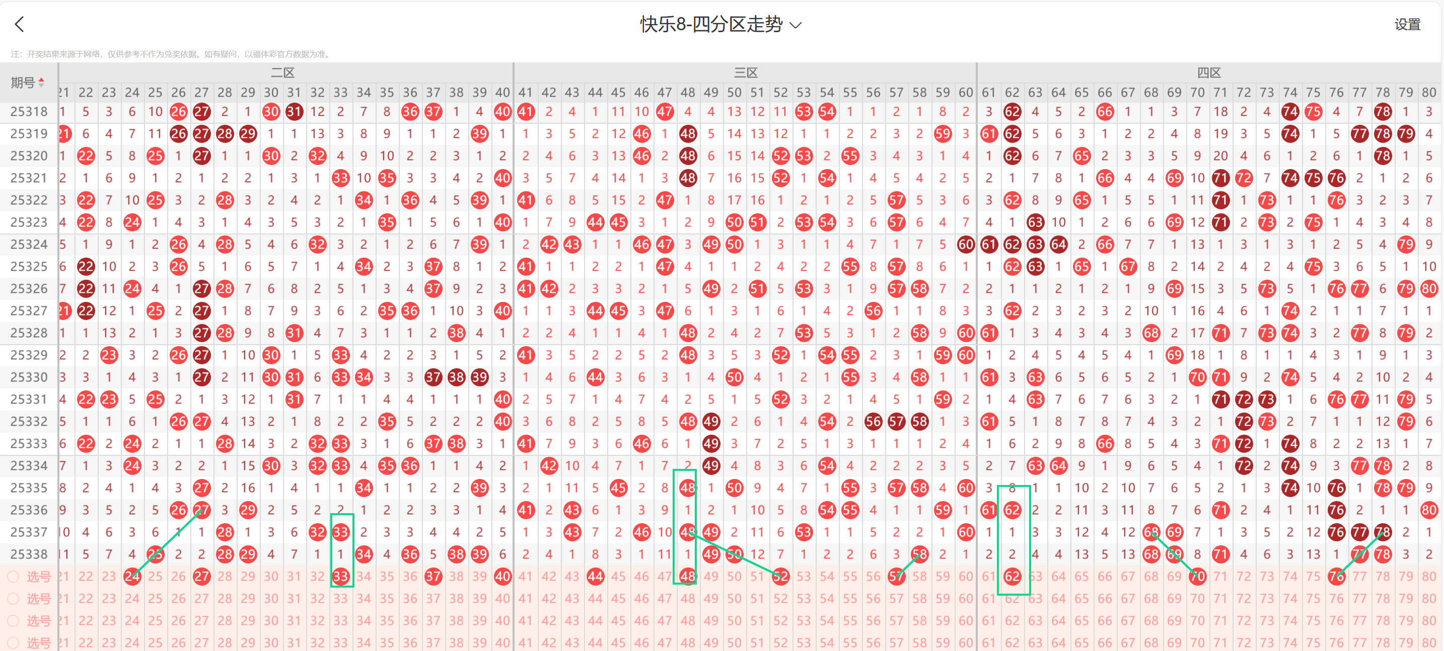 * **策略核心**:对三区进行“广域覆盖,重点聚焦”,增加该区间选号比例,重点关注41-48这一广阔空白带。