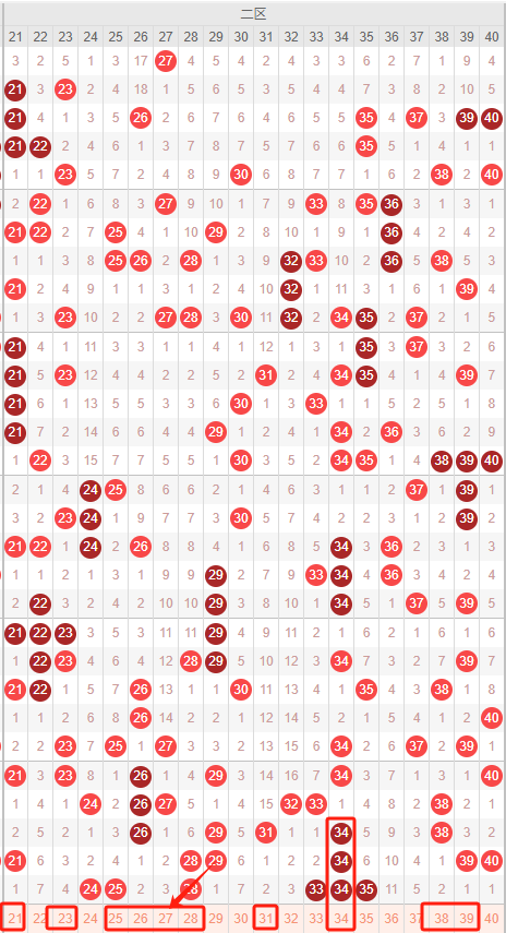 二区:最近二区10期出号情况为:4 6 6 2 6 6 6 5 6 6,总出号情况为53个,平均出号5.3个,本期二区号码还是比较弱势推荐:21 23 25 26 27 28 31 34 38 39。重点关注:21 25 26 27 28 38 39。