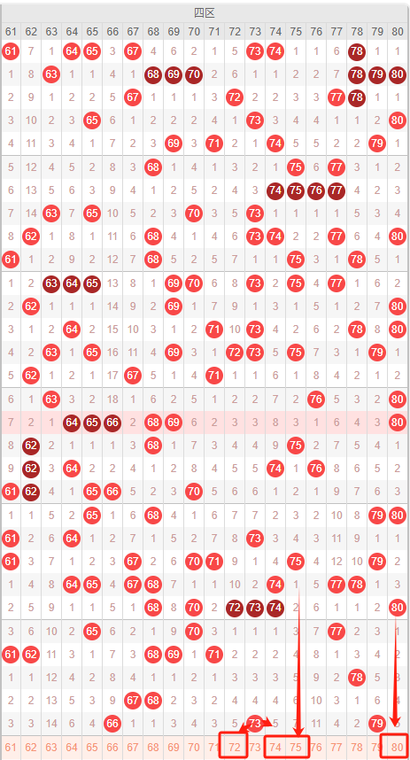 四区:最近四区10期出号情况为:4 3 6 7 5 3 5 1 2 3,总出号情况为39,平均出号3.9个,本期四区号码推荐:72 74 75 80。重点关注:74 75 80。