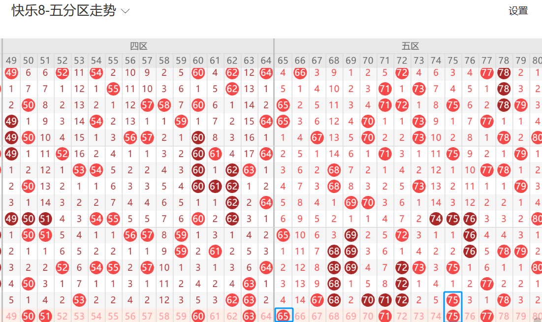 五区胆尾5尾,即65.75出一,本期选75了,不一定对,如果喜欢65的坚持,这个区的特点就是重号热,其次关注71重号,比较看好71.75同出,另外看好边号77,所以重点关注65.71.75.77,三胆71.75.77,双胆71.75,主胆75.是不是可以考虑选二复三65.71.75亦或者直接选三71.75.77呢。