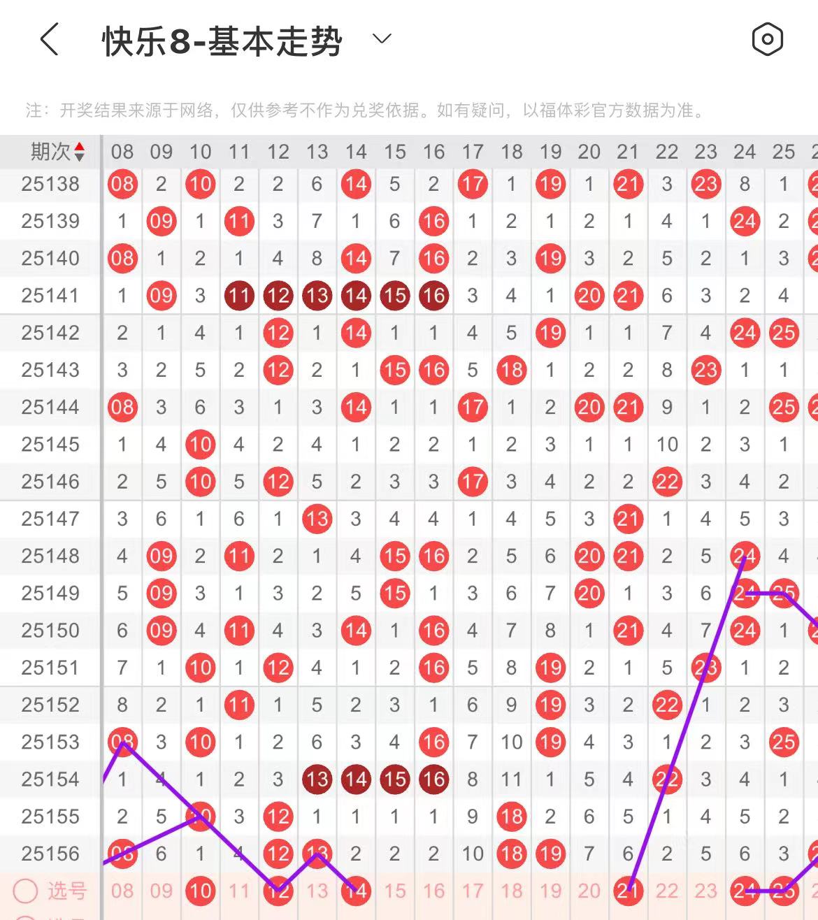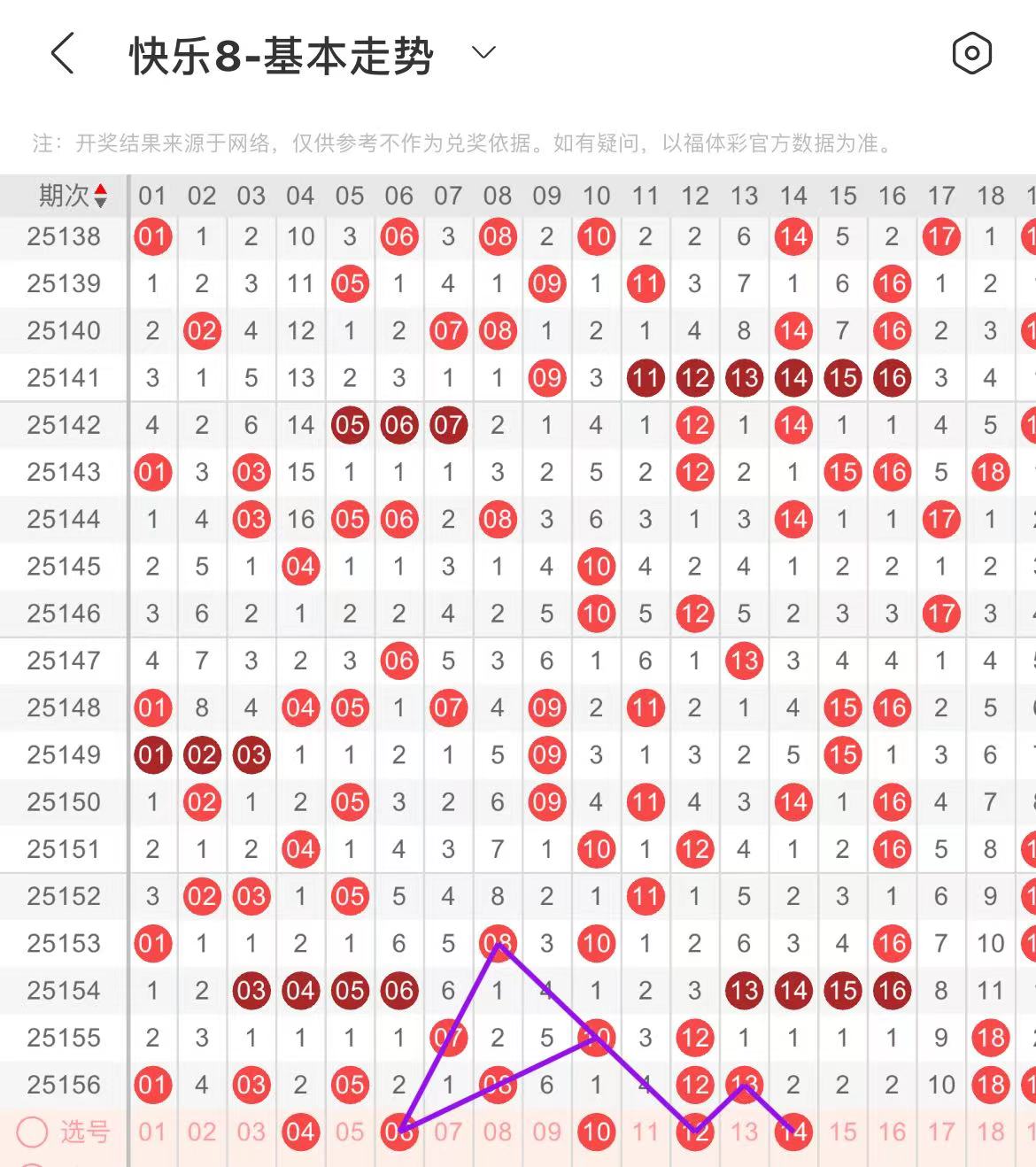 11-20区:本区间上期开出了四个号码,从号码走势图上看,本期重点关注前半区号码号码回补,出号个数应该在两三个号码之间。本期有出号走势的号码有12.14号,做分边出号考虑,后半区可考虑18走三重的可能。