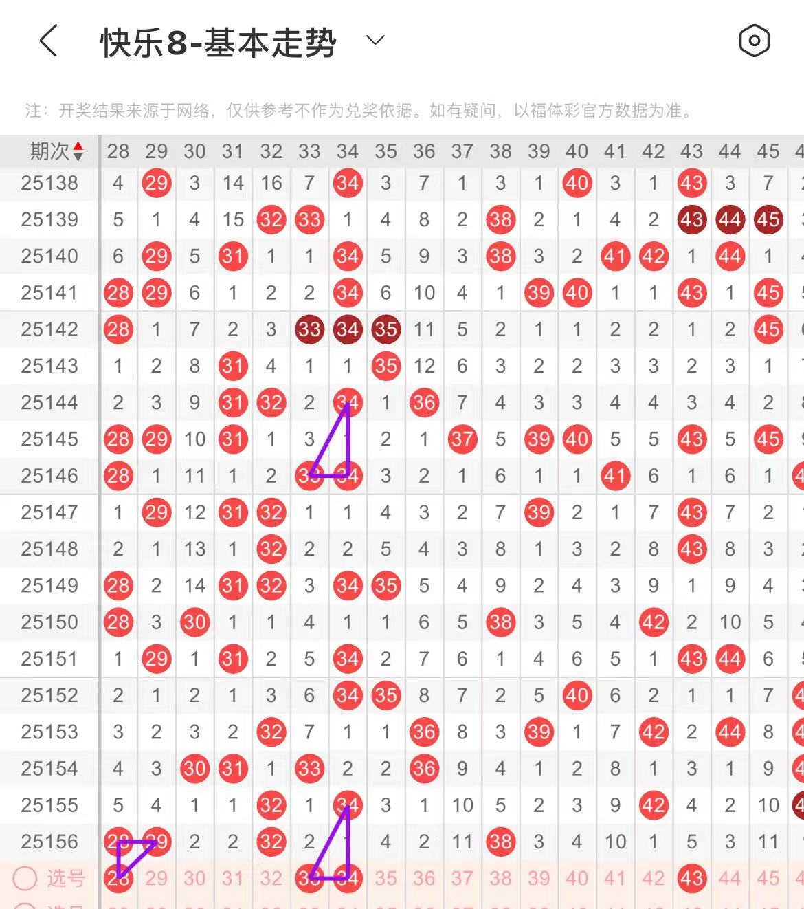 31-40区:本区间上期开出了两个号码,从号码走势图上看,该区现属于温号区,出号个数保持在两个号码左右,本期出号个数变化应该不是很大。本期有出号走势的号码有33.34号,形成一个三角走势形态。