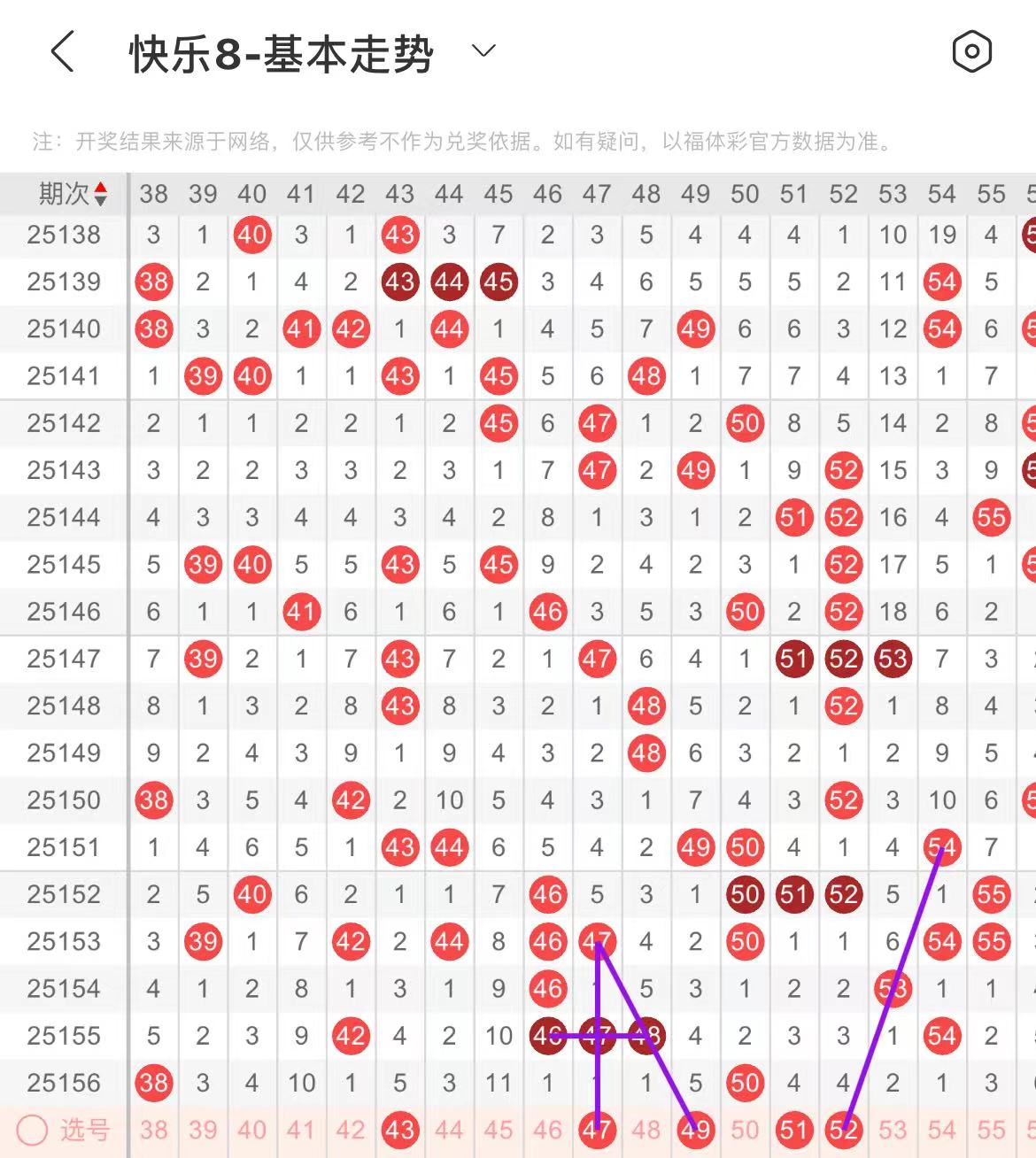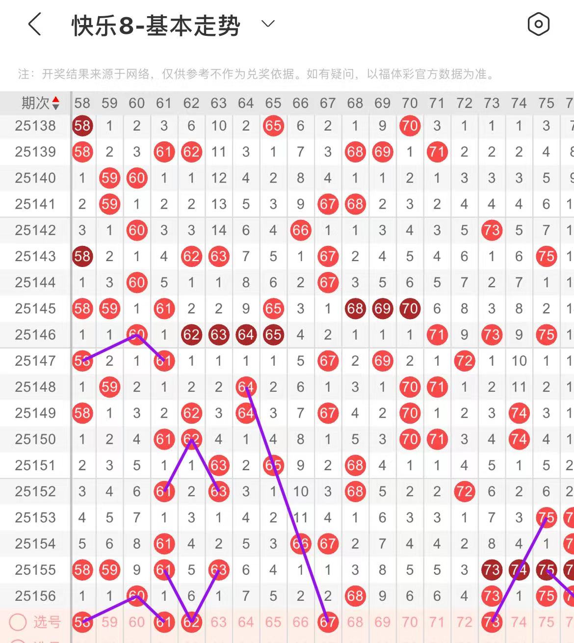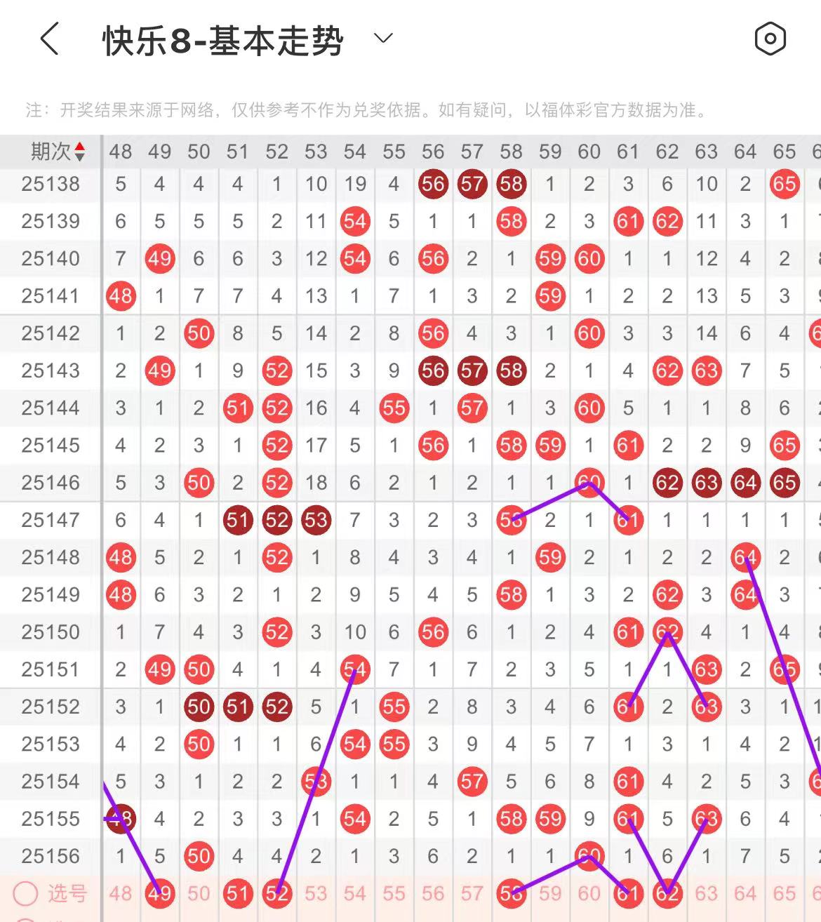 51-60区:本区间上期开出了一个号码,从号码走势图上看,本期重点关注区头区尾号码回补,出号个数应该在两三个号码之间。本期有出号走势的号码有52号,斜连出号走势,防51.52同出的可能,58号,60对应60出号走势。