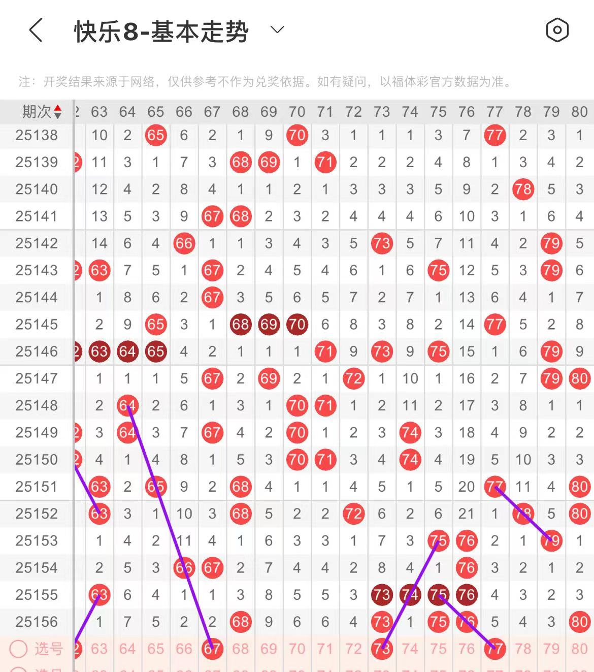 71-80区:本区间上期开出了四个号码,从号码走势图上看,该区现属于温热区,本期出号个数应该还能保持在三个号码左右。本期有出号走势的号码有73号,斜连出号走三重,77号,斜连出号走势。