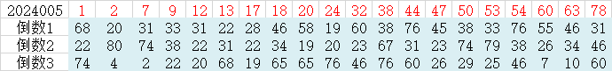 可以看出,每一组对应号码两两和值为80。这一组补数在2024005期开出5个。