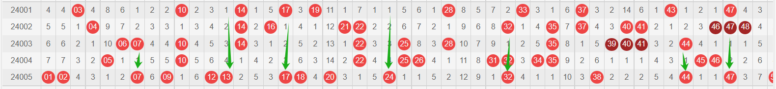 这个条件可以理解为追热号,主要是选取遗漏小于5期的号码来做大底,通过号码分布图我们也能看出,每期都有重复号,都有上期号码的相邻号,再仔细观察下面的部分分布图,2024005期,按照【号码(遗漏)】的方式统计出来是:1(7),2(7),7(1),9(5),12(6),13(4),17(3),........。可以看出遗漏小于5的号码比较常见,这就是一个大概率事件,我们就可以用这个梳理出一部分号码,用来作为我们交集的一组号码。