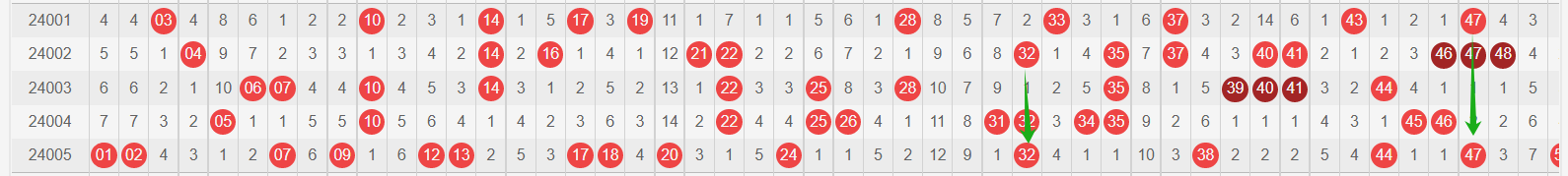 我感觉选热的同时,还要注意防冷条件开出,可以直接选取每个号码跟随出次前三的号码,也可以考虑把出次最后的三个数字加进去,不过这样可能号码太多,可以尝试。图上也能看出单独号码跟随的情况,我就不一一统计每个号码的出次了,我这里考虑提高概率,取每个号码历史跟随的前三号码和后三号码,根据2024005期的号码,我关注正数3和倒数3的号码号码为: