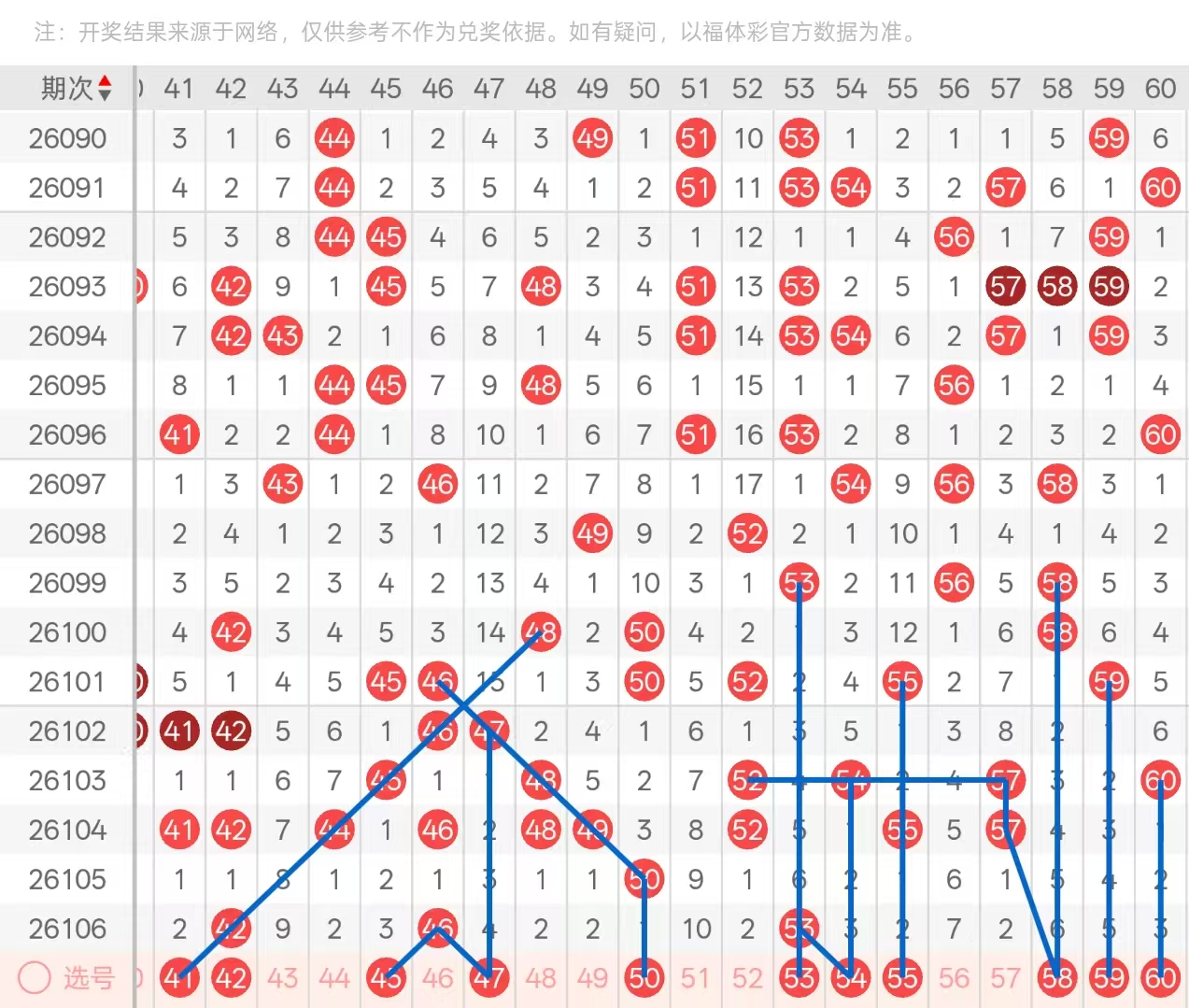 三区:三区间上区开出了3码,四字头头部位置开出了空1,空1第四期下落的42,以及中部位置第三次空一下落的46,两码均以孤码形态开出,尾部位置处于放空状态,五字头则开出了头部位置六期遗漏下落52的孤码双重空一分边的53,以孤码形态开出,后半部分处于放空状态。本期4字头头部位置可考虑两期遗漏回补的41下落,且42的孤码在本期可防守做重,九期遗漏下落的43与41两码防守开出即可,做二选一。中部位置46的孤码本期可优先考虑分边号码4547的下落,其次尾部位置4849的对子,可考虑49的空2回补,以及50的斜连空一下落。五字头本期头部位置关注孤码53的座重,且分边后面5354,优先考虑54的三期遗漏回补,中部位置空2等距的55也需要防守开出,其次尾部位置57的孤码双重空2分边优先关注58的六期遗漏回补,尾部位置5961两码同期遗漏,可优先考虑59。