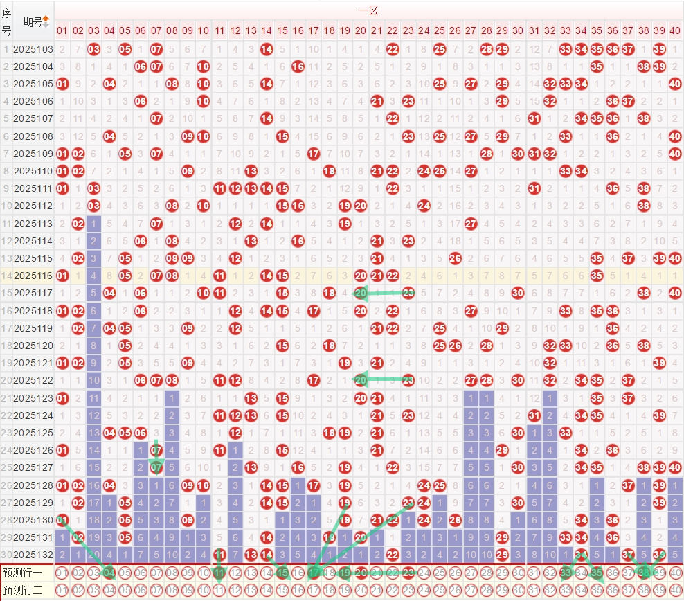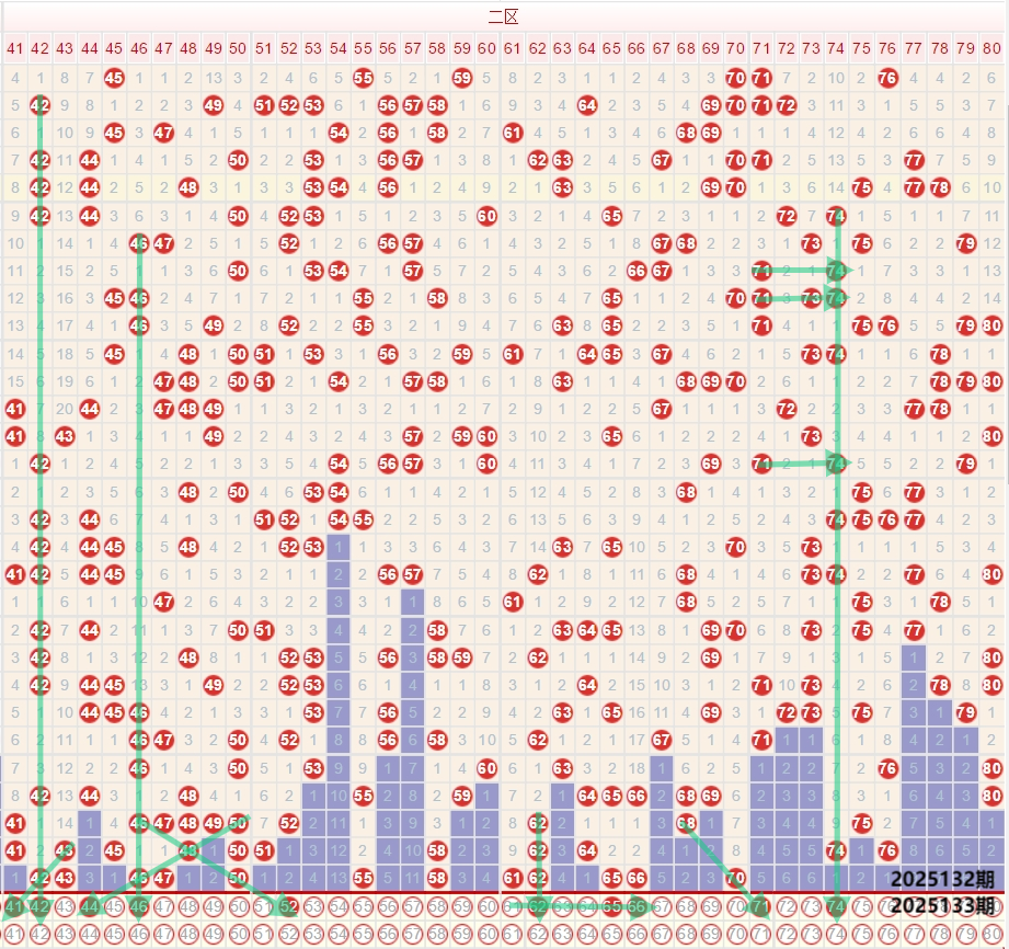 如图所示:在本期大数区的选号中注意在上期的走势中三区间开出了枚中奖号码,依旧是保持在区间落号分布的最高位走势,4字头依旧是保持着爆号的走势,开除了5枚中奖号码,本期4字头的号码可继续考虑高位走势,建议考虑4枚号码,三区间的走势注意高低位走势,本期在4字头的号码中可继续考虑斜线三连的走势,在上期的开奖走势中斜线三连的走势开出了2/5的走势,落号比例还是比较高的,本期还有着41 43 47的斜线三连走势,还可考虑1-2枚的形态保持走势,5字头的号码注意低位走势,四区间的号码在上期的开奖结果中出现了断7头的走势,本期注意71的回补走势,以及65 66的小四点同步走重形态,前段位置注意62号的重号第四期走势。