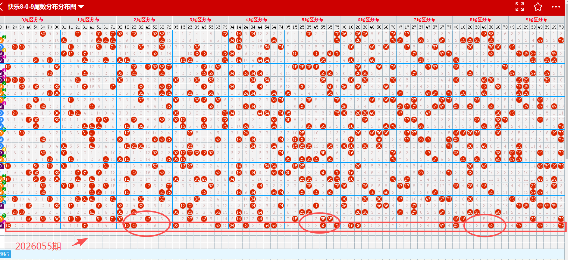 上图是快乐八2026055期的尾码走势图,从图中看0尾到9尾出号个数依次是:0尾号码区开出1个;1尾号码区开出1个;2尾号码区开出2个;3尾号码区开出2个;4尾号码区开出4个;5尾号码区开出2个;6尾号码区开出2个;7尾号码区开出1个;8尾号码区开出2个;9尾号码区开出3个;再看小尾号码(0尾-4尾)区有10码,大尾号码(5尾-9尾)有10码;数据比对统计后可以看到本期4尾出号数量最多,一共开出了4个中奖号码。本期没有尾区出现断区!由走势比对推断2026056期重点需要关注2、5、8尾区号码下号热度回补和落号数量增加的概率较大。