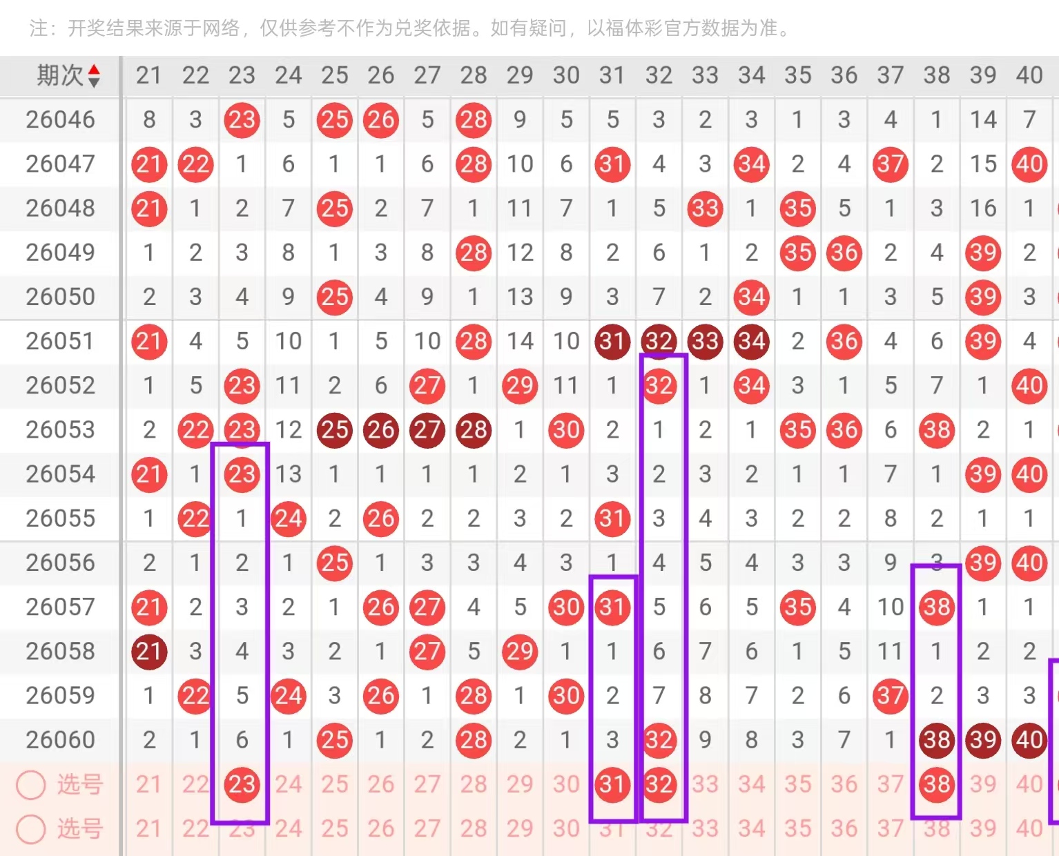 二区21-40:二区间,上一期回补了6个号码的下落,从近期二区间号码下落点位来看,连续走热了两期遗漏,今天我们要重点关注的是二区间空缺位置的下落和重码的一个回补,在二头首先我们要重点关注的是23-27的一个回补点位,和31-32的一个回补点位,今天这里可用23-31和27-32的一个搭配回补,这里要重点防的是开出对子回补的可能,回到尾部位置,这里要重点关注的是3连下方重码的一个回补点位,38-40-2下1的选择值得我们重点关注,这里要重点防的是36-38的搭配为补。