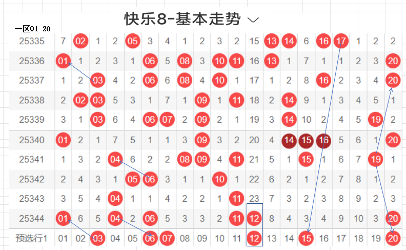 白菜快乐8第345期分析:上期专属选三对二,四码对三,五码对四