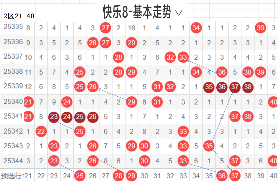 二区(21-40):遗漏5期以下有16个,0码23 26 30 33 37 40 6个,数据所示,冷码平均,选择条件增多了.上期开出了6个号码,出码比较分散.这期布防相应增加,重码按比例落这区较少,先给出关联码36,这个区间间接走势,温区,21-30区间上期开了3个,依旧不是重点选号区间,31-40区间开出3个,本期关注热码的回补,间隔小遗漏值最佳,3字头转热,这个小区热码注意回调,可以做关联码的布局,注重温冷码的回补.