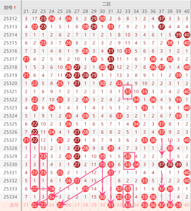 二区间注意参考号22.23.25.28.33.34.35.36.37.38.40中关注3-4码开出机会。