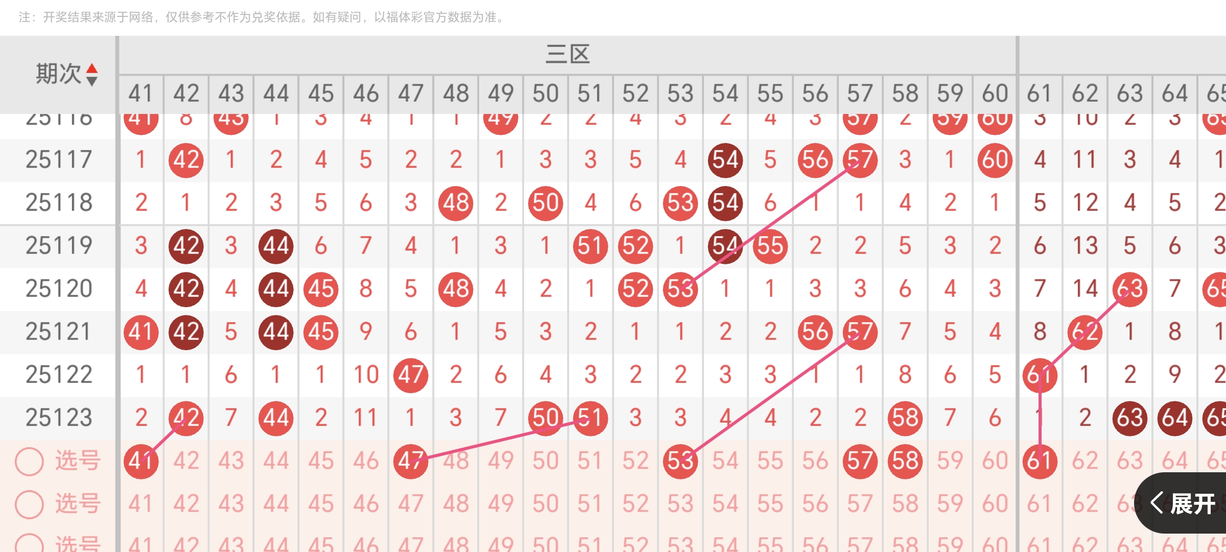 第三区间首先看一码龙头位置的41号,边码的走势以及隔期回补几率挺大,可与61做选二搭配组合 41 61。然后看一码47,它是51的跟随号,最近出的很频繁,可以关注一下。后部分看一码53走势也很漂亮,尾部看57 58对子回补。第三区间胆码主看41 47。