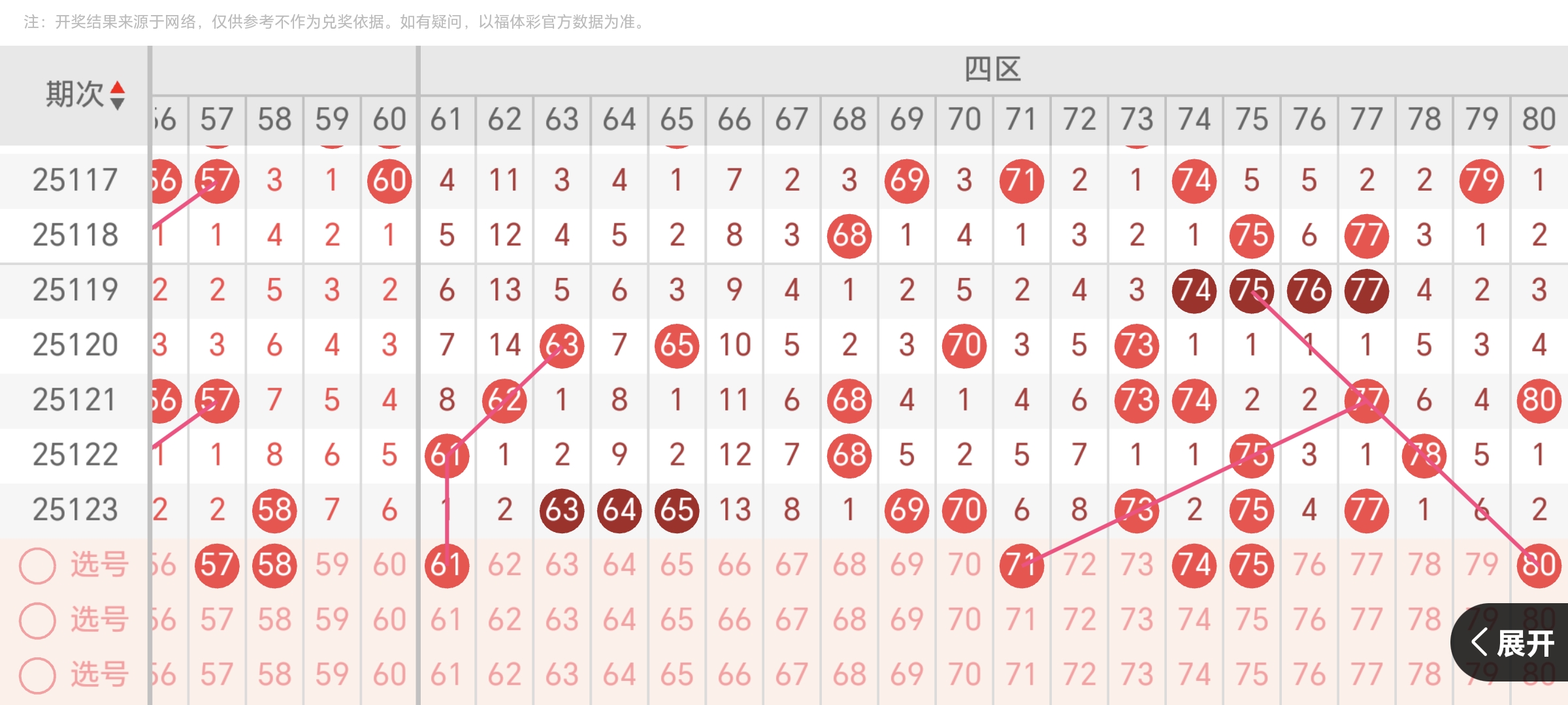 第四区间首先看龙头位置的61,他可与41搭配选二组合。再看一码71的隔期四斜连走势很完美,然后看74 75的对子回补做75的终结形态。尾部就看一码80的斜连对称走势回补。第四区间主看胆码61 71。