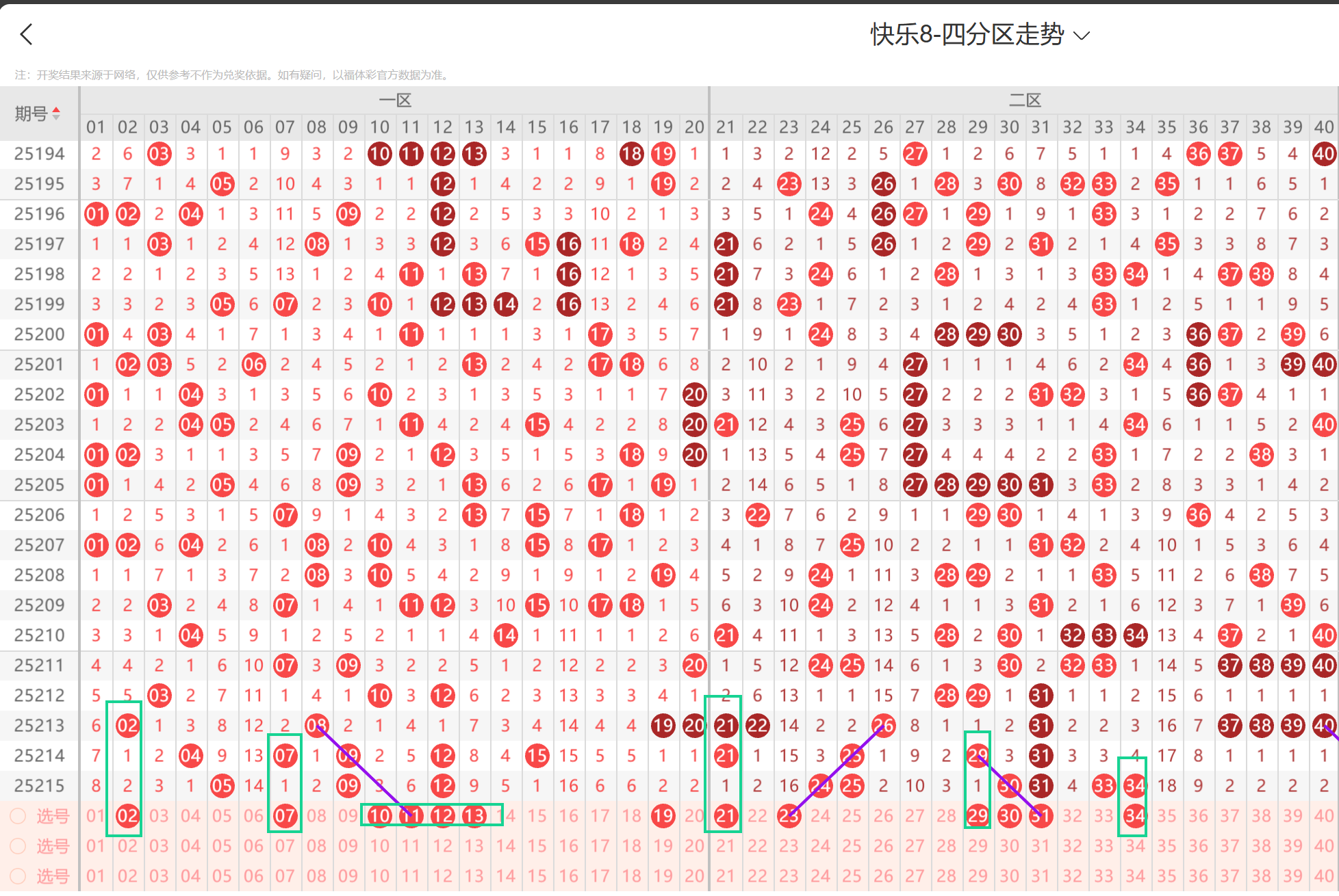 第2025216期福彩快乐8通过以下走势图及一二区间预测分析如下: